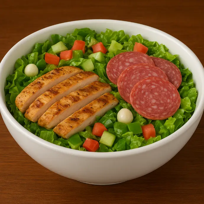 Grilled chicken breast, Genoa salami, romaine, diced tomato, green bell pepper, cucumber, and mozzarella.